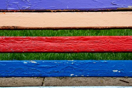 Colorful wooden bench with water drops on it. Selective focus.