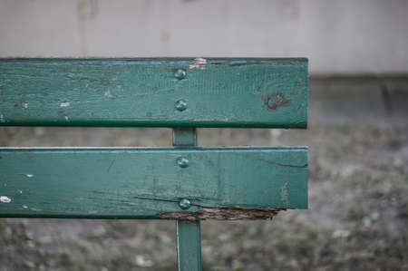 Old wooden brown bench close-up. In the background a blurred green park. Concept.