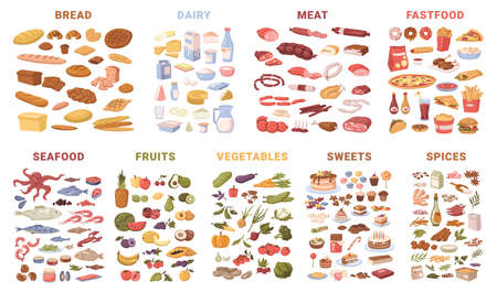 Set of food, isolated butchery and grocery products. Vector in flat style, bread pastry and dairy, meat and fast-food, seafood and fruits, vegetables and sweets spices, fastfood and takeaway snacks