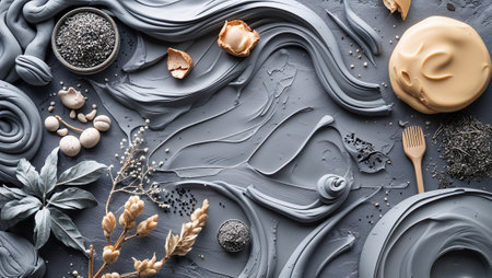 Gray and beige cosmetic clay swirls arranged on a dark surface, accompanied by dried flowers, poppy seeds, and a small wooden tool, creating a soothing spa atmosphere. Ai generated image