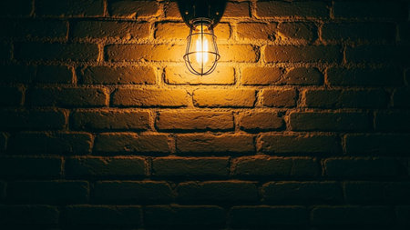 Lamp on a brick wall in the dark, illuminated by yellow light