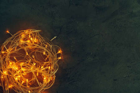 Warm light illuminated garland close up on dark background
