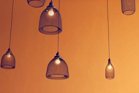 beautiful lamps in a dark room, plafonds in a club, restaurant. A beautiful dark room with old lamps with yellow light. Festive light.
