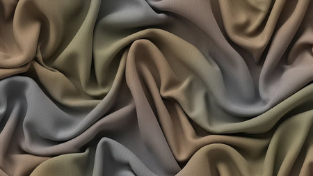 Wavy fabric shows a gradient of muted earthy tones, transitioning from warm beige to cool gray. soft waves and subtle color shifts create a sophisticated textile texture.
