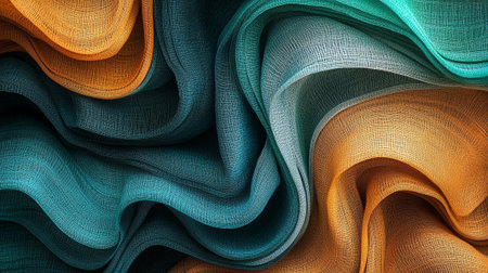 multi-colored linen drapery fabric in the background showcases a captivating blend of dark turquoise and dark amber hues. the fabric features gridded abstractions and layered veneer panels, creating a visually intriguing pattern. with tonal variations in color, this traditional vietnamese-inspired design embodies the essence of ssaku hanga. the sleek lines add a touch of modernity to this stunning piece. ai generated