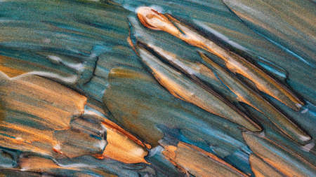 Blue-green glitter texture background. Creative brushstrokes of glitter gold paint. Sparkling surface of blue-green paint strokes with a dash of gold paint