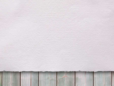 Top view of a blank sheet of white paper lying on a textured wooden rustic desk with dark edges of the image.