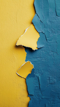 A vibrant yellow wall features a crack that exposes a bright blue surface underneath. The uneven edges of the tear create an intriguing contrast, highlighting the texture and colors.