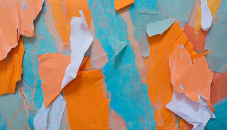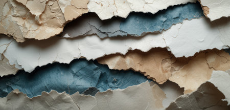 Diverse torn paper textures overlap artistically forming an abstract backdrop that inspires creativity and distinctive design possibilities. The layered colors and patterns invite exploration.