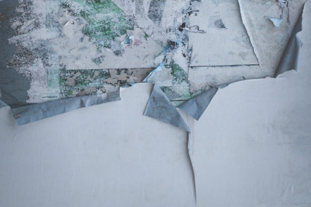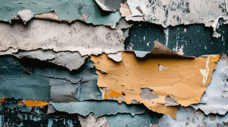 Torn crumpled and peeling pieces of old paper layers on billboard. Abstract urban grunge background.