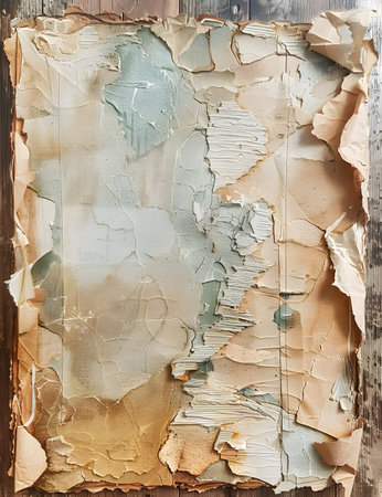 A close-up of a wall with peeling paint and paper, revealing layers of different colors and textures.