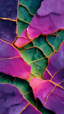 Closeup view of a semiprecious violet stone slab intersected by vibrant orange and green glowing cracks, creating a vivid natural pattern ideal for decor.