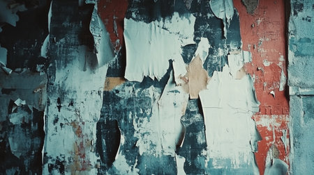 Artistic Urban Street Background with Grungy Wall with Ripped, Torn And Peeled Posters. Old Wall with Scratched Advertising. Old Billboard with Torn Posters. Vintage Wide Background and Texture.