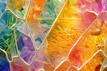 Textured plastic film overlay with visible dust particles illuminated in vibrant colors