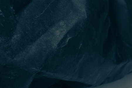 Extreme close up of blue empty plastic bag background. The plastic surface is wrinkly and tattered making abstract pattern. Selective focus, shallow depth of field.