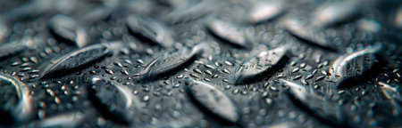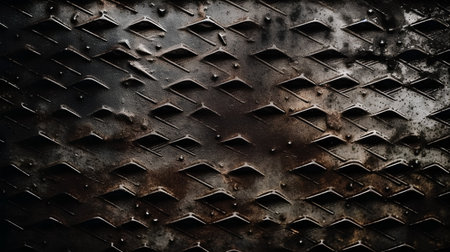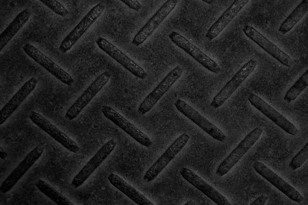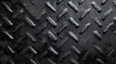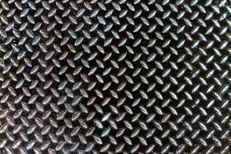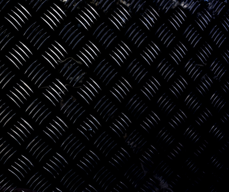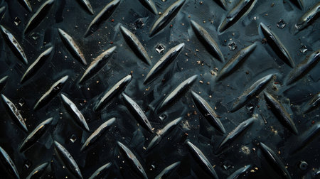 Close-up view of a textured black metal surface featuring a raised diamond pattern. Perfect for industrial, construction themes or artistic backgrounds.