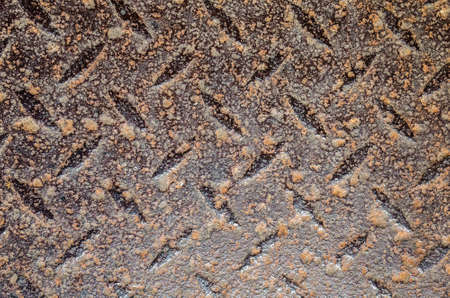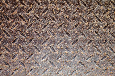 A close-up view of a rusty metal surface, featuring a diamond-shaped pattern, showing the texture and imperfections of aged metal. The surface is covered in rust and dirt.