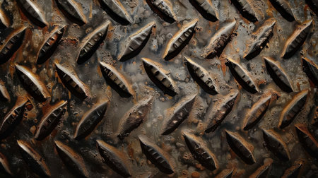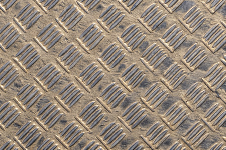 A close-up view of a textured metal surface featuring a diamond pattern, showing signs of wear and grime, conveying a sense of industrial use and ruggedness.