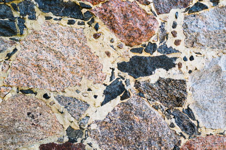 close-up of a wall made of various sized and colored stones. The stones are of different sizes, ranging from small to large