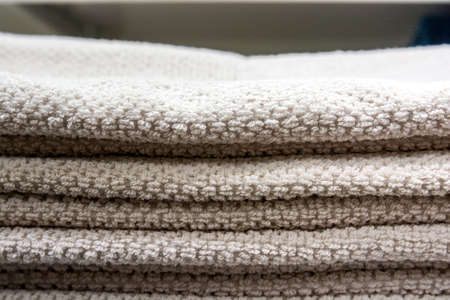 Stack of bath towels. Home textiles for spa treatments. Soft fluffy fabric texture. Vertical storage