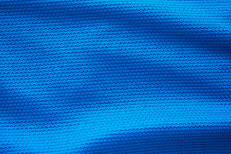 Blue football jersey clothing fabric texture sports wear background, close up top view