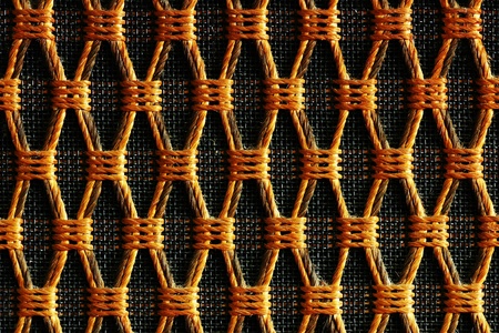 Abstract background of cross-stitched fabric with colored threads. Close-up, vertical photograph.
