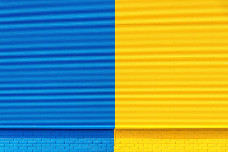 the textured background from corrugated iron and a brick of yellow and blue color and a blank space for the text