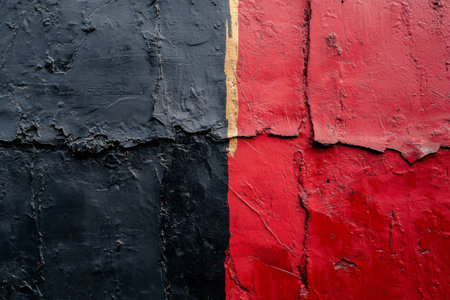 Two textured wall panels, one black and one red, meet at a sharp edge, enhanced by a narrow golden line. The rough surfaces suggest weathering and age in an urban environment.