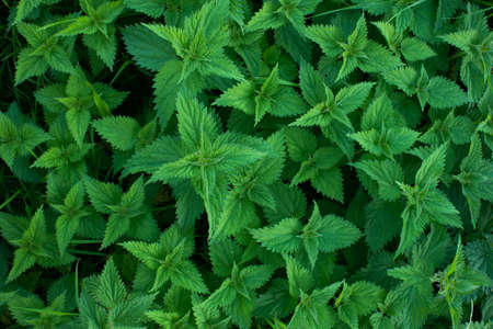 Fresh nettle leaves background. Top view of the thicket of nettles. Green leaves background. nature background