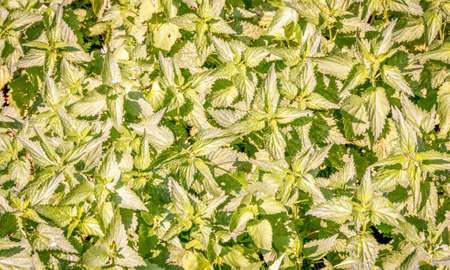 Stinging nettle plants background, Urtica dioica leaves, overhead view
