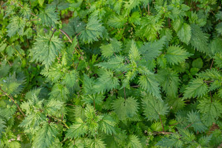 Urtica dioica, common or stinging nettles background. Fresh green nettles in springtime, alternative medicine, healthy herb