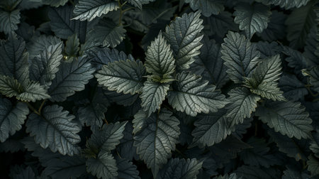 Background of deep dark green nettle leaves top view. Stock photography.