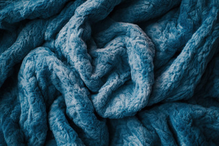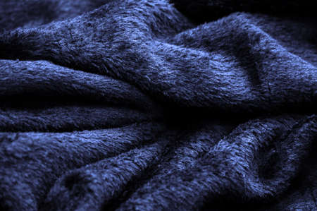 Blue delicate soft background of fur plush smooth fabric. Texture of fleecy blanket textile. Faux fur textile background. Selective focus.