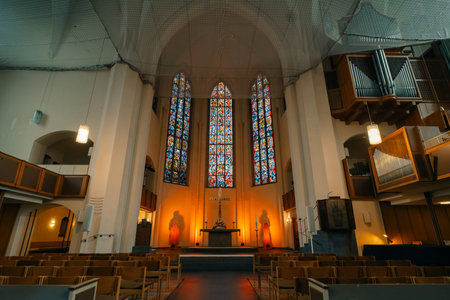 Majestic Interior of a Historic Church with Ornate Gothic Architecture and Vibrant Stained Glass Windows Creating a Serene and Spiritual Atmosphere for Worship and Devotion