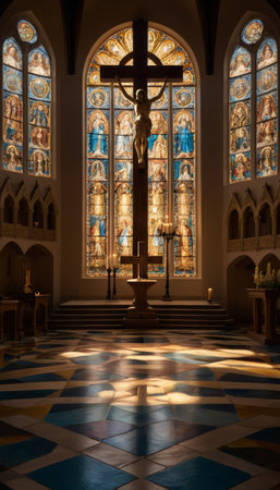 A stunning view of a colorful stained glass window in a church, with a bright cross illuminated by sunbeams, conveying serenity and spirituality.