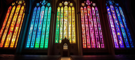 A stunning view of light filtering through intricate stained glass windows in a gothic church, creating a serene and spiritual atmosphere.