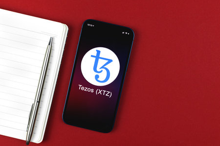 Tezos symbol. Trade with cryptocurrency, digital and virtual money, banking with mobile phone concept. Business workspace, table top view