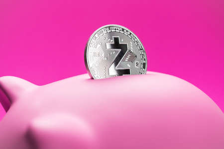 Zcash zec physical coin in pink piggy bank with some copy space. Close-up photo of zcash in pig moneybox with shallow depth of field.