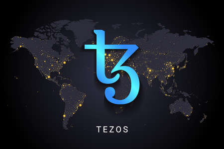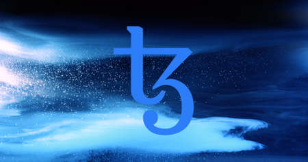 Coin Tezos XTZ cryptocurrency on the background of binary crypto matrix text and price chart.