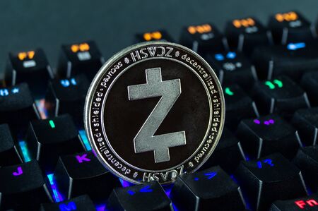 Coin cryptocurrency zcash close-up of the colour-coded keyboard background
