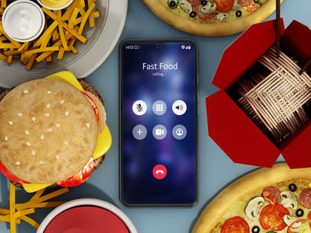 Fast foods and smartphone with fast food calling screen. 3D illustration.