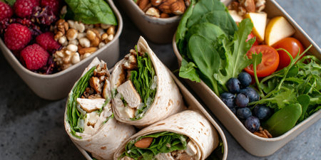 Healthy meal with wraps, salad, and fruit at a dining table in daylight