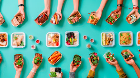 top view of various food in hands with empty copy space for text. food delivery concept.