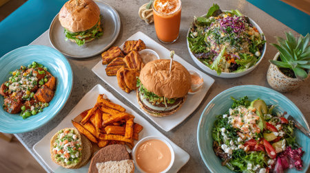 A vibrant assortment of delicious dishes including burgers, salads, and sweet potato fries arranged beautifully on a dining table, showcasing fresh ingredients and flavors.
