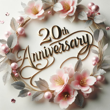 A delicate '20th Anniversary' encircled by a floral garland on a white background signifies two decades of partnership.
