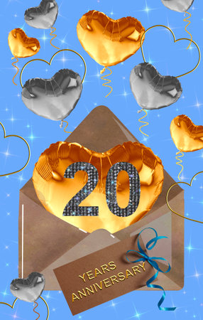 20 years anniversary vector logo, icon. Template banner, symbol with heart shape air hot balloon for 20th anniversary greeting card