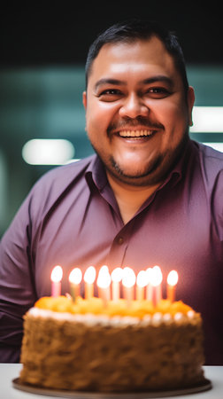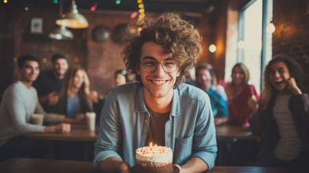 AI Generative Young man blowing out candles on cake, happy birthday celebration