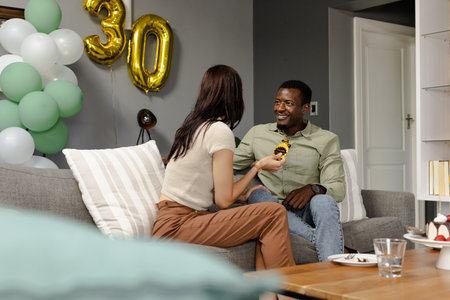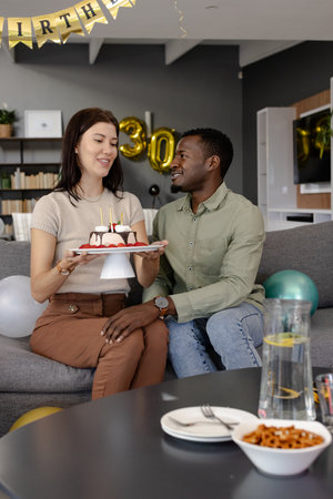 Celebrating birthday, woman presenting cake to smiling African American man on couch. Celebration, party, surprise, happiness, relationship, togetherness