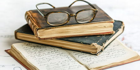 Stacked old books accompany handwritten notes and a pencil, conveying a sense of history, learning, and creativity in a serene study environment.