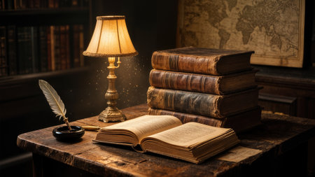 A beautifully arranged scene featuring vintage books and handwritten notes on a wooden table, capturing the essence of solitude, literature, and inspiring creativity within a serene library environment.